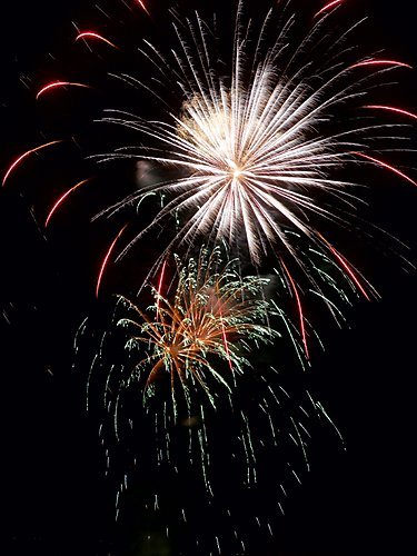 Beschreibung: Ein Motiv aus dem Kalender Feuer... über der Stadt / Roland Störmer: Ein typisches Feuerwerk bei einer abendlichen Veranstaltung in einer Kleinstadt. Treffend im Bild festgehalten. Einzelne Feuerwerkskörper separiert ? gleich einem Portrait.